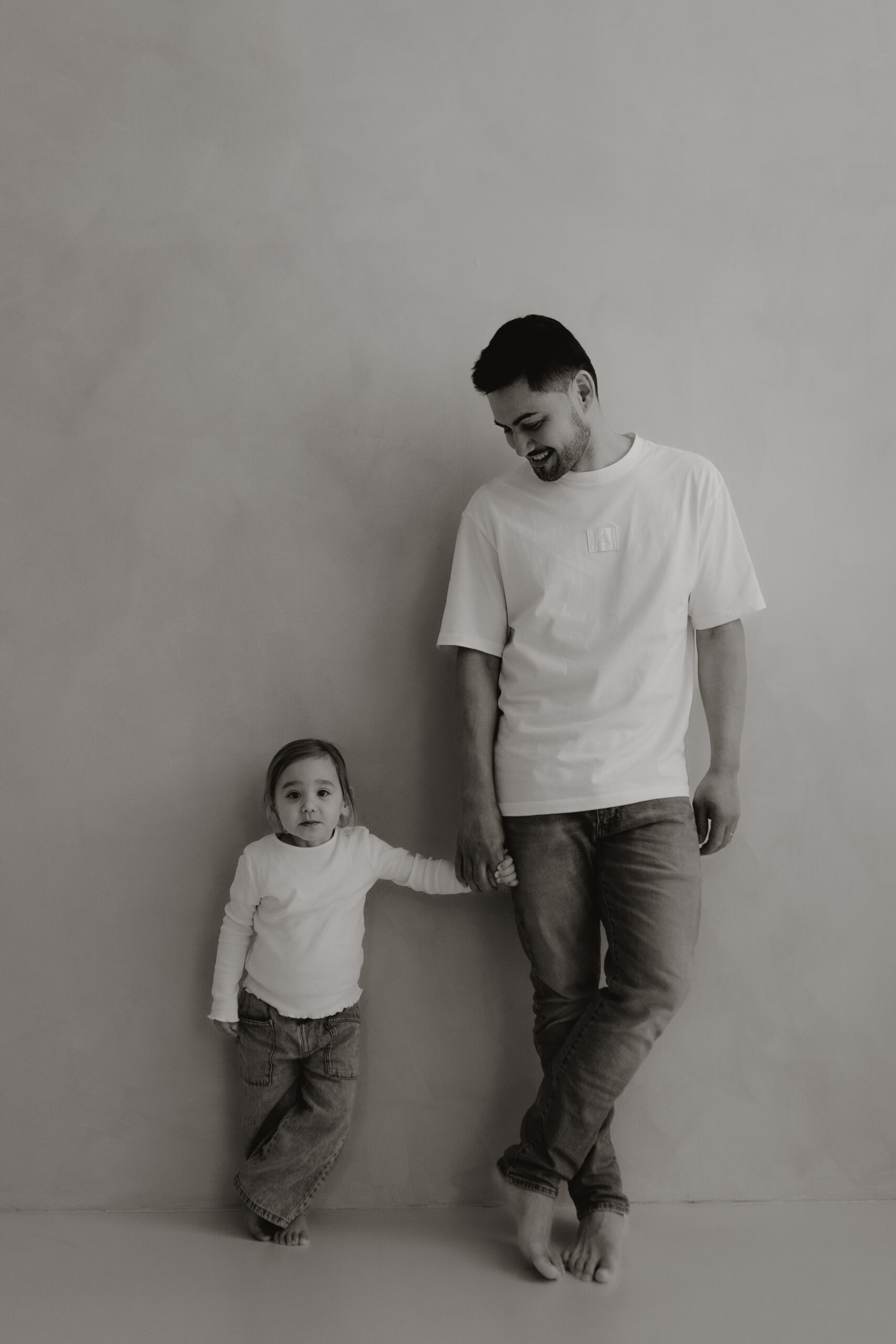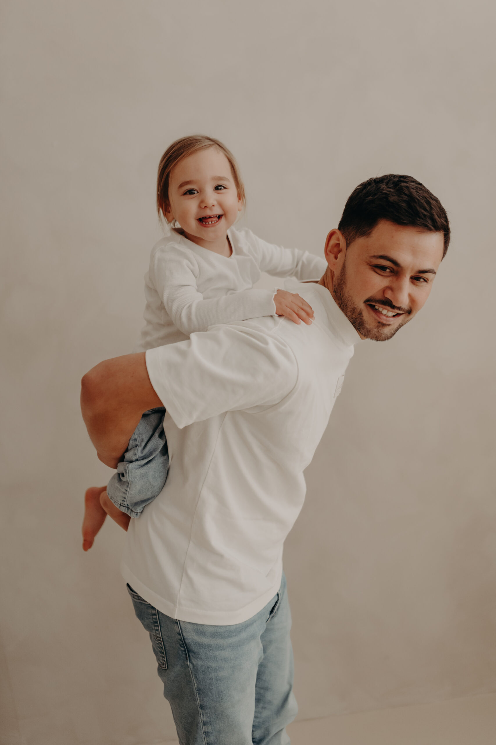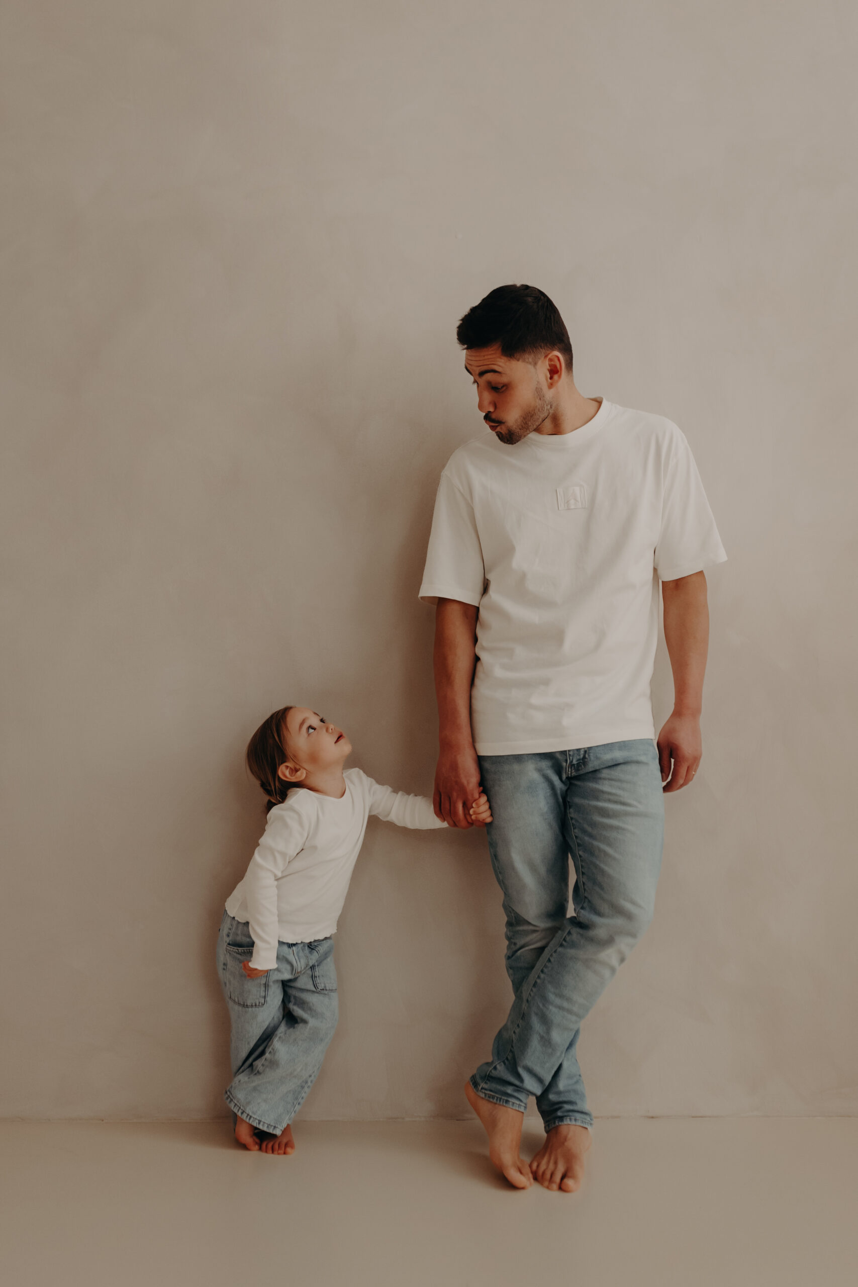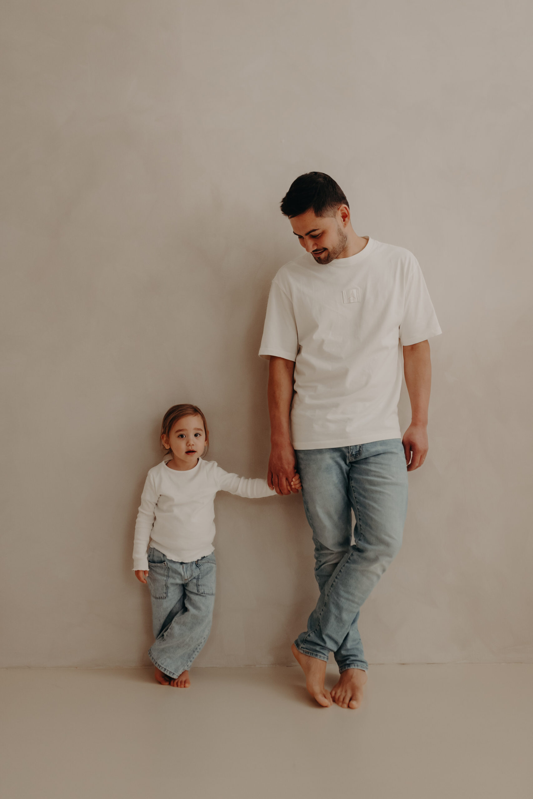 Ein leises Rauschen von zarten Schritten hallt durch das Fotostudio – ein kleiner Wirbelwind, der die Luft mit seiner kindlichen Unbeschwertheit füllt. Die Schwester, ein strahlender Stern, betritt den Raum mit einem Lächeln, das die Sonne umarmt. In heller Kleidung und Jeans gekleidet, strahlt sie eine unschuldige Reinheit aus, die die Herzen derer berührt, die sie umgeben.
