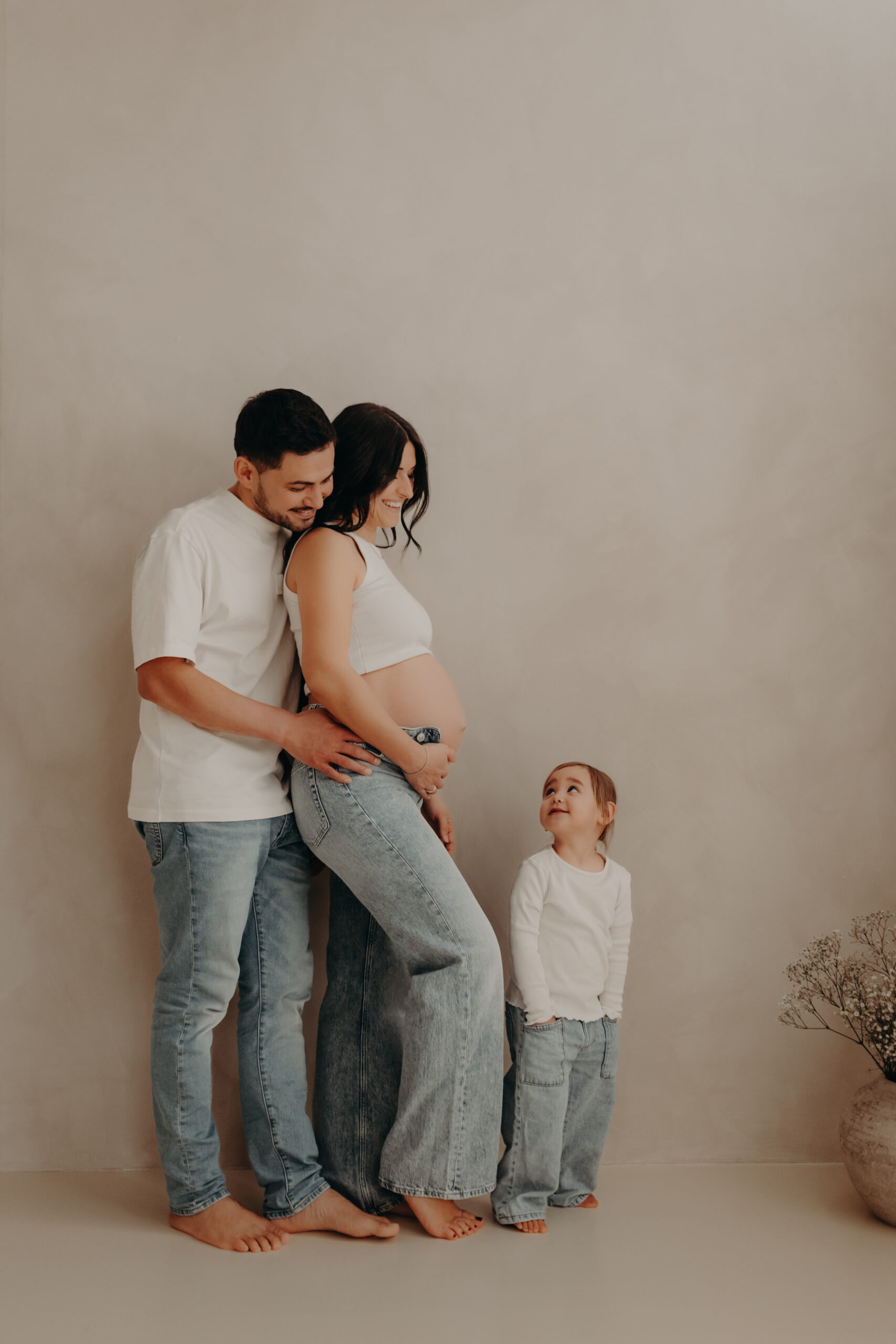 Mama und Papa, vereint in ihrer Vorfreude auf das kommende Wunder des Lebens, umgeben die grosse Schwester mit liebevoller Hingabe. Jeder Blick, jede Berührung spricht von einer tiefen Verbundenheit, die über Worte hinausgeht. Es ist, als ob die Zeit selbst innehalten würde, um diesen perfekten Moment festzuhalten – die Liebe einer Familie, eingefangen in einem stillen Tanz der Emotionen.